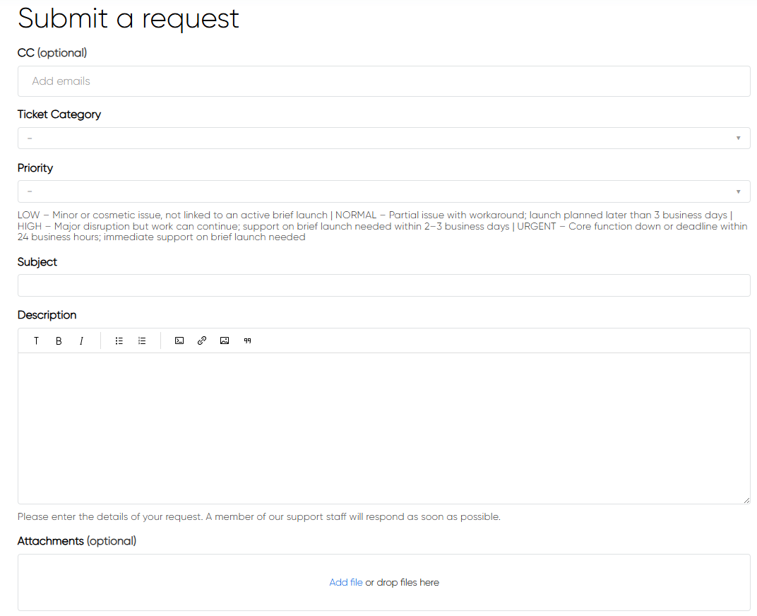 - Priority - Specify the priority of your request (please note that the Bulbshare SMG team may lower or raise the priority based on the request itself). Refer to "Understand your request priority levels" article for more details.