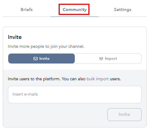 Admins can invite members individually via email, bulk upload via CSV, or (optionally) connect via CRM integration. Go to Community session under your channel and either invite via emails or vial bulk import. Once added, click Invite.